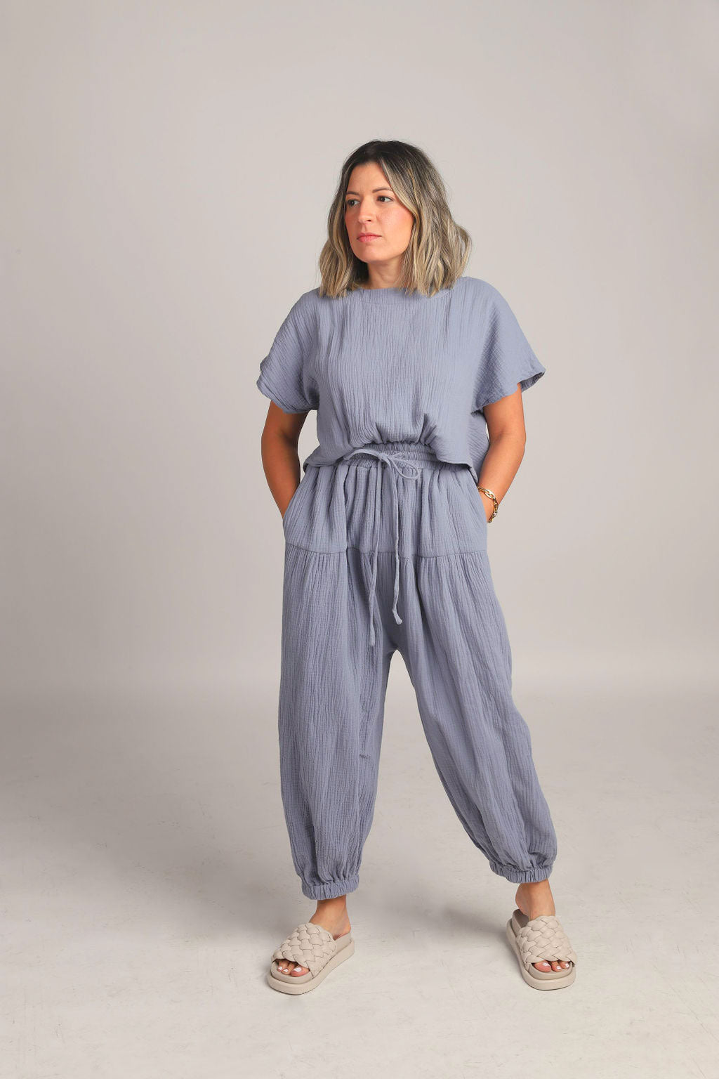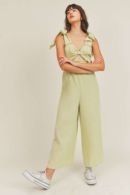 A laced jumpsuit features a padded lace bodice with tie up back, ruffle tiered wide leg, sleeveless, and an adjustable strap.